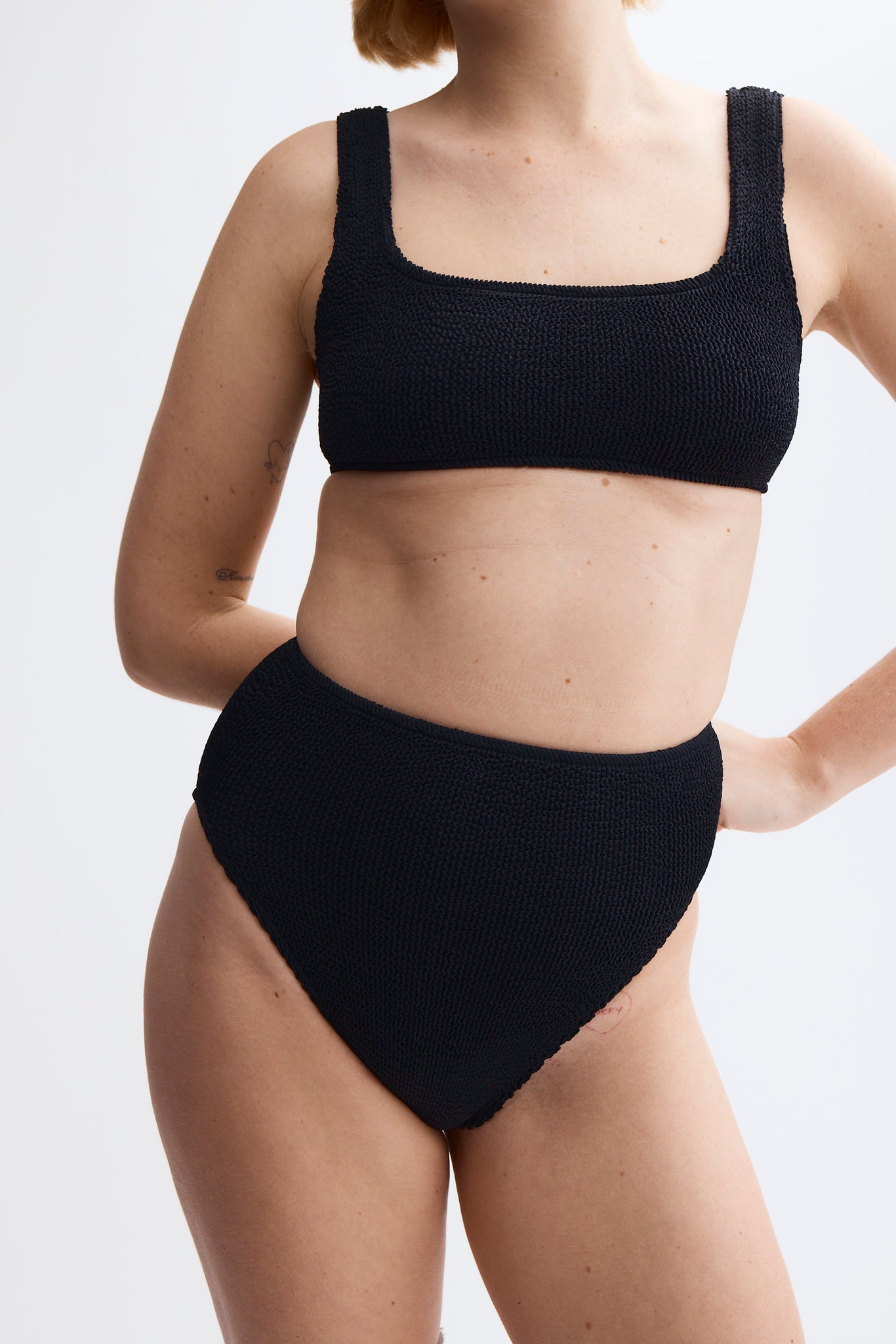 High Waist bikini bottoms offer a little more hip and belly coverage than Standard and can be worn above or below the belly button.